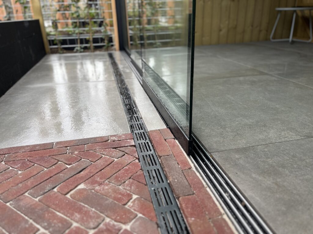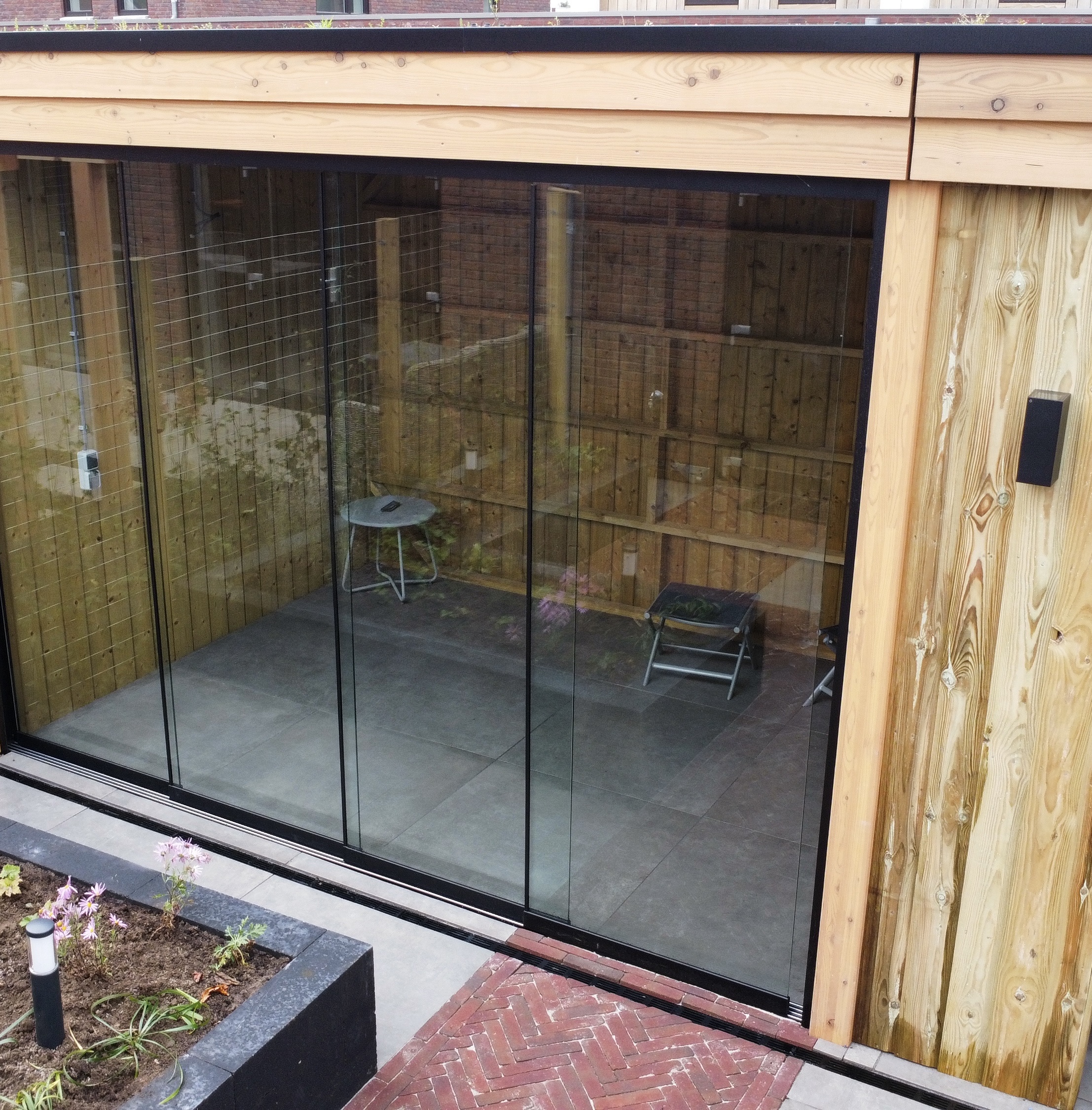 De bestaande overkapping is voorzien van een glazenschuifwand, waardoor de buitenruimte het hele jaar door benut kan worden. In-lite verlichting maakt het plaatje compleet en zorgt ’s avonds voor een warme en sfeervolle ambiance.