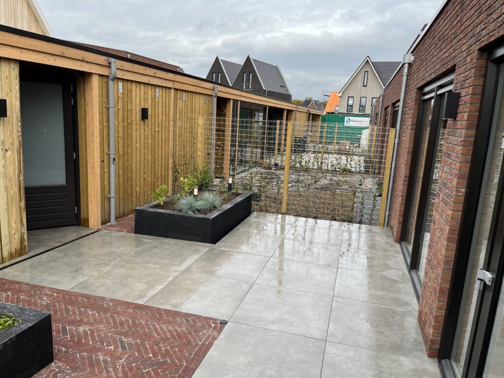 Robuuste plantenbakken geven de tuin diepte en bieden ruimte voor groene accenten. De gebakken bestrating, gelegd in keperverband, creëert een mooie looplijn die het ontwerp versterkt. Deze wordt afgewisseld met grote 80×80 cm keramische tegels, wat zorgt voor een speels en toch rustig geheel.
